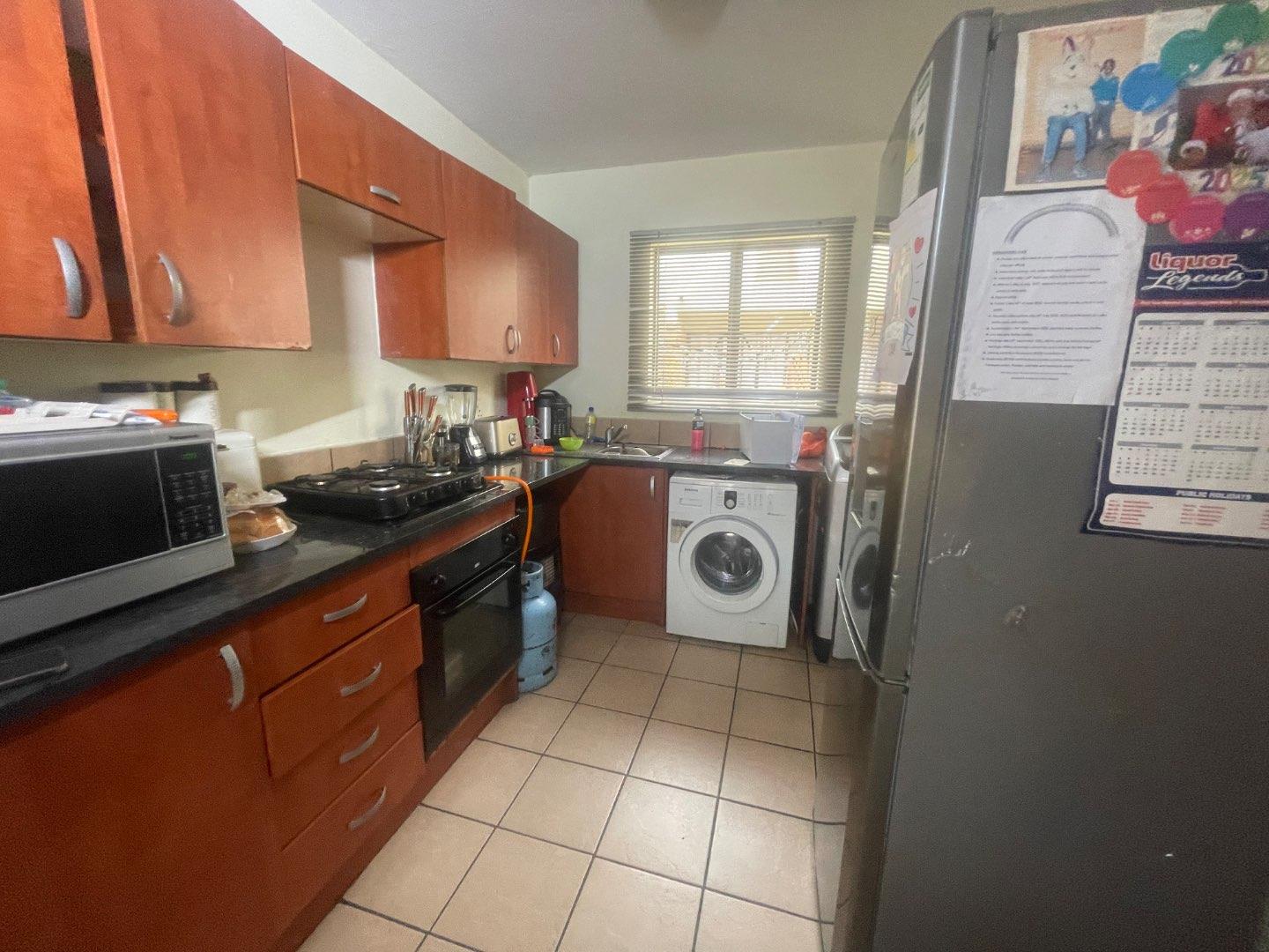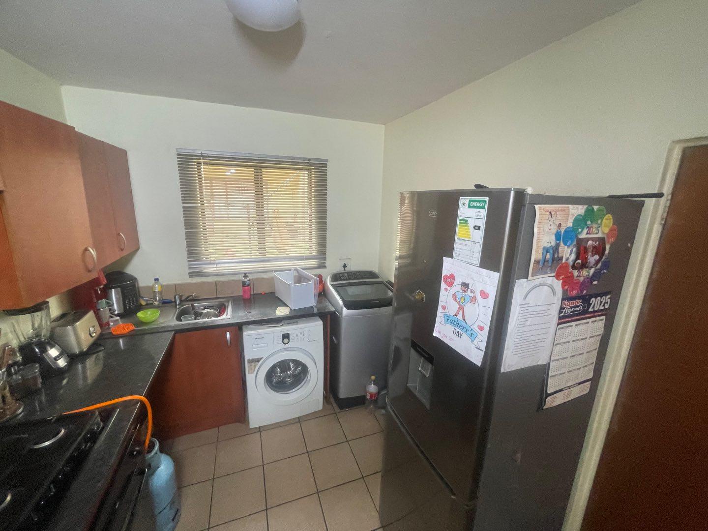 The open-plan kitchen and living area create a welcoming space, ideal for unwinding or entertaining guests. Additionally, two covered parking spaces ensure secure accommodation for your vehicles. The estate boasts amenities such as a swimming pool and a braai area—perfect for enjoying sunny days with family and friends.